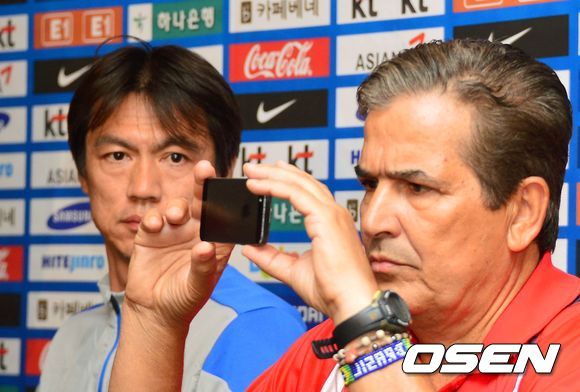홍명보 감독이 취재진을 휴대폰에 담는 핀토 감독을 바라보고 있다./spjj@osen.co.kr