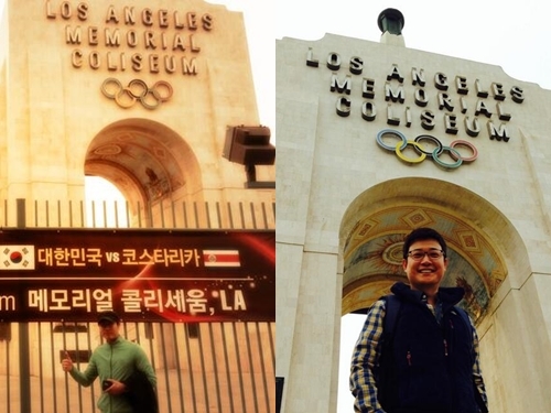 [OSEN=임승미 인턴기자] 방송인 김성주가 전 국가대표 축구선수 출신 송종국과 미국 로스엔젤레스에 위치한 메모리얼 콜리세움 경기장 앞에서 찍은 사진을 공개했다.