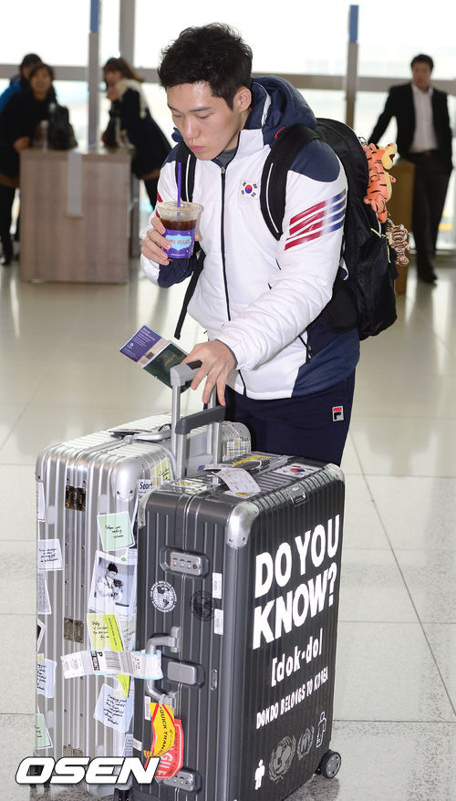모태범이 독도 문구가 적힌 트렁크를 이동시키고 있다.