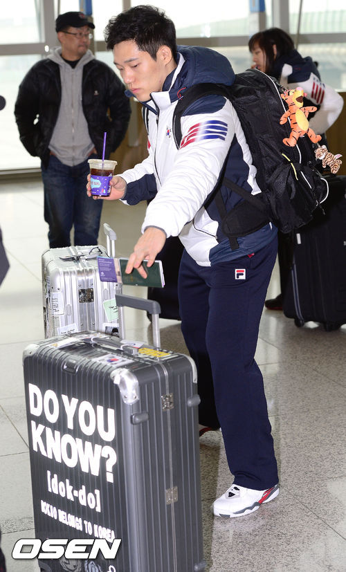 모태범이 독도 문구가 적힌 트렁크를 이동시키고 있다.