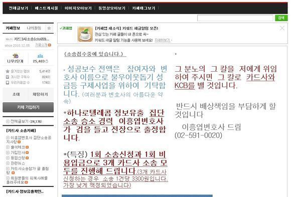 카드사 정보유출 집단소송 카페의 가입자 수가 지속적으로 늘어나고 있는 추세다. 그런데 이를 범죄의 수단으로 이용하는 이들이 생겨 각별한 주의가 요구되는 상황이다.