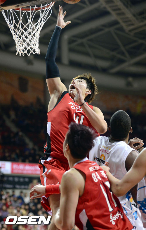 25일 경기 안양실내체육관서 열린 2013-2014 KB국민카드 프로농구 정규리그 안양 KGC와 전주 KCC의 경기 1쿼터 KGC 오세근이 레이업슛을 성공시키고 있다.