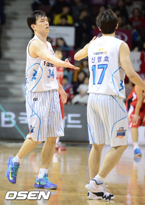 25일 경기 안양실내체육관서 열린 2013-2014 KB국민카드 프로농구 정규리그 안양 KGC와 전주 KCC의 경기 2쿼터 버저비터를 성공시킨 KCC 김효범이 신명호와 하이파이브를 하고 있다