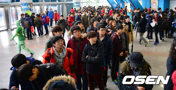 25일 오후 인천 삼산월드체육관에서 '판도라TV LOL 챔피언스(이하 롤챔스) 윈터 2013-2014시즌' 결승전을 앞두고 팬들이 입장을 기다리고 있다.