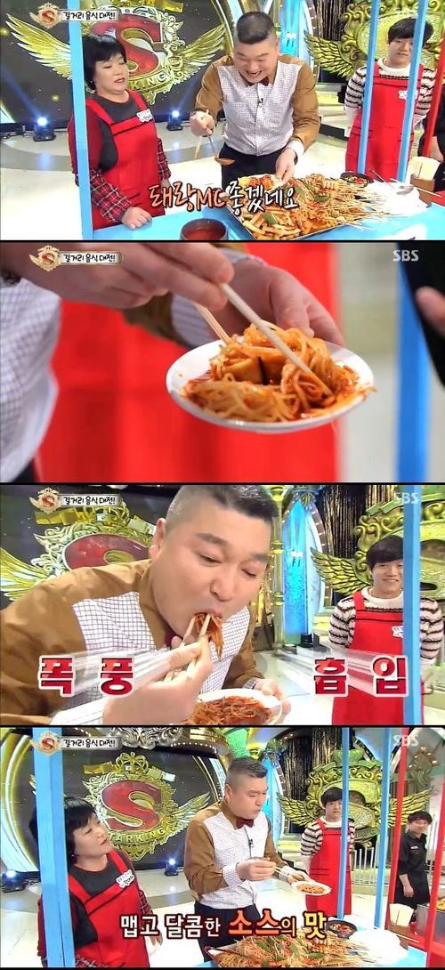 강호동은 25일 오후 방송된 SBS 예능프로그램 '놀라운 대회 스타킹'에서 펼쳐진 길거리 음식 대전 중 콩나물 어묵을 맛보고 감탄을 금치 못했다.