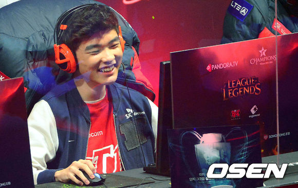 SKT K 중단 '페이커' 이상혁이 1경기 승기를 잡자 미소를 짓고 있다.