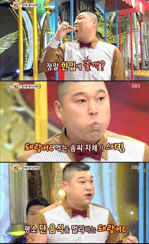 이날 방송에서 강호동은 긴 꽈배기를 한 입에 넣었다. 그리고 끊지 않고 끝까지 입으로 밀어넣었다. 이와 함께 '돼랑 MC 먹는 솜씨가 스타킹'이라는 자막이 등장해 웃음을 자아냈다.