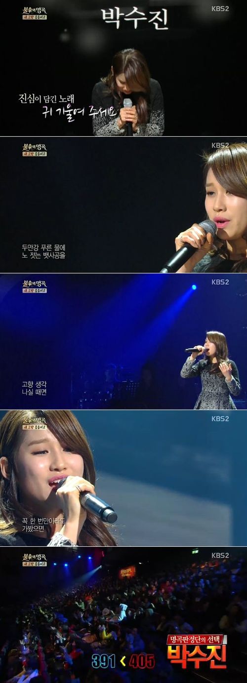 박수진은 5일 오후 방송된 KBS 2TV '불후의 명곡-전설을 노래하다'(이하 '불후')에서 세 번째로 무대에 올라 '라구요'로 깊이 있는 울림을 전했다. '라구요'는 강산에가 실향민인 어머니를 위해 만든 곡으로 분단의 현실을 서정적으로 표현한 노랫말로 실향민들의 심금을 울렸던 곡.