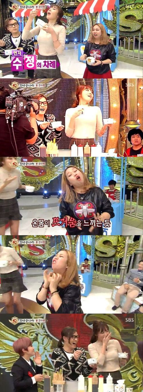 이수정과 홍현희는 25일 오후 방송된 SBS 예능프로그램 '놀라운 대회 스타킹'에서 불 문어빵 먹방을 동시에 선보였다. 한 사람은 요염한 웨이브로, 또 한 사람은 뜨거움을 느끼는 처절한 표정으로 맛을 표현했다.