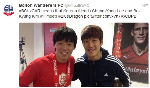 볼튼은 25일(이하 한국시간) 공식 트위터를 통해 이청용과 김보경이 함께 찍은 사진을 게재했다. "볼튼과 카디프 시티의 대결이 의미하는 것은 이청용과 김보경 두 한국인 친구가 만난다는 것"이라는 말과 함께 게재된 사진 속에는 환하게 웃고 있는 두 선수의 모습이 담겨있다.