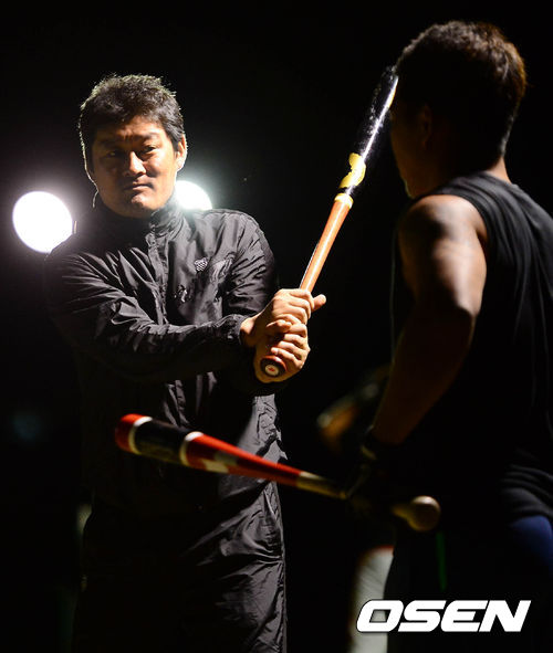 25일 오후 일본 오키나와 서든 비치 호텔 야외 훈련장에서 이종범 코치와 정근우가 이야기를 나누고 있다.