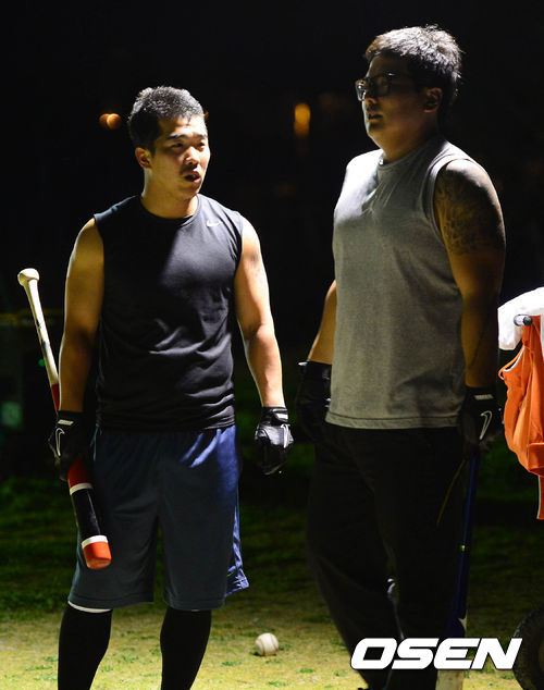 25일 오후 일본 오키나와 서든 비치 호텔 야외 훈련장에서 정근우와 김태균이 이야기를 나누고 있다.