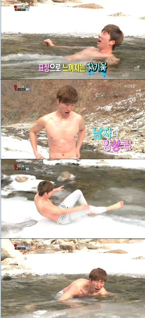 양상국은 옷을 벗은 뒤 착잡한 표정으로 계곡물에 발을 디뎠다. 그는 얼음에 미끄러져 미끄럼틀을 타듯 계곡물에 입수했다. 그는 고통스러워하면서도 전신을 계곡에 몸을 담가 보는 이들을 충격에 빠뜨렸다.