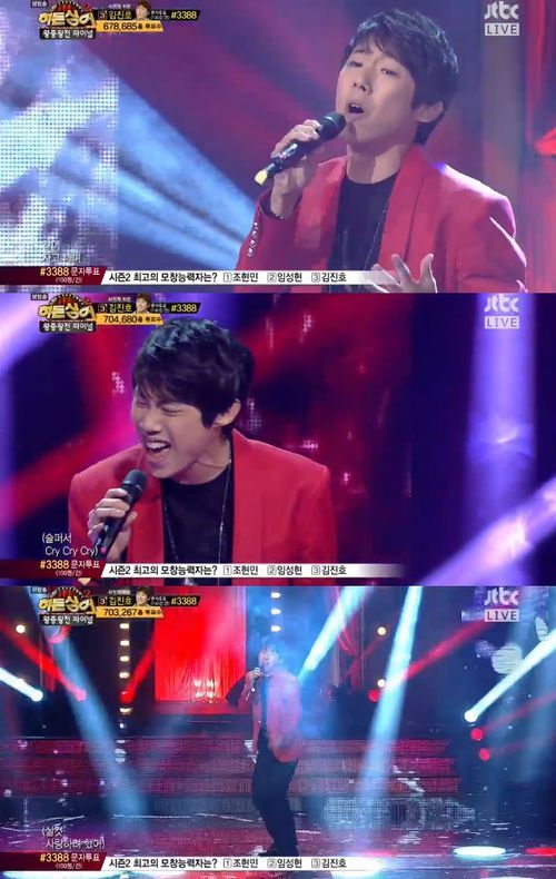 이날 마지막으로 '사랑해 휘성' 김진호가 휘성의 '결혼까지 생각했어'를 선곡해 열창했다. 김진호는 휘성 특유의 비음뿐 아니라 가창력까지 겸비, 놀라운 무대를 선사했다.
