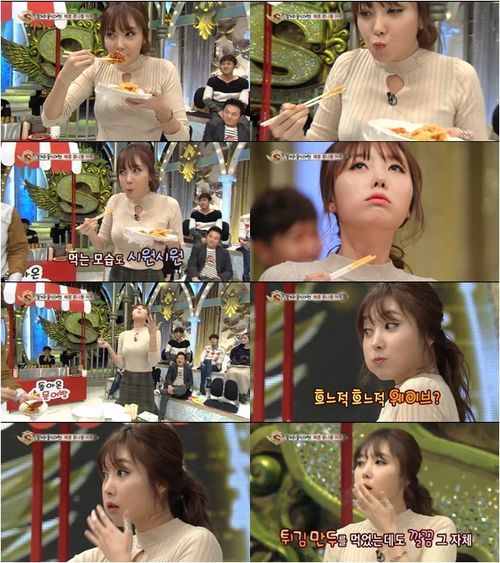 그는 뜨거운 ‘불 문어빵’과 ‘콩나물 어묵 볶음’을 먹었는데 뜨거워서 마치 섹시한 표정을 짓는 것처럼 보였다. 특히 베이지색의 딱 달라붙는 의상을 입고 뜨거워서 어쩔 줄 몰라하는 모습은 마치 섹시 댄스를 추는 것처럼 비쳐졌다.