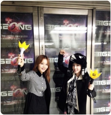 공개된 사진 속 산다라박과 이하이는 손을 힘껏 든 채 환한 미소를 짓고 있다. 두 사람 뒤로는 빅뱅 콘서트의 포스터가 붙어 있다. 부피가 큰 모자를 써 얼굴이 더욱 작아 보이는 산다라박과 단정한 옷차림으로 여성미를 강조한 이하이의 미모가 돋보인다.