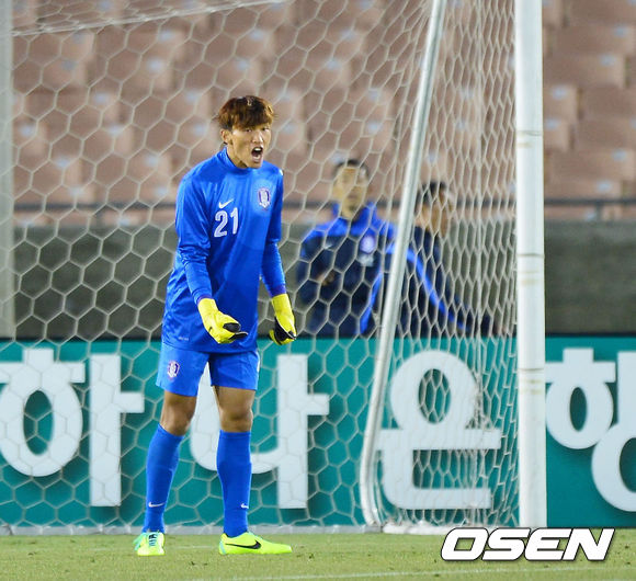 전반 한국 김승규 골키퍼가 동료들을 격려하고 있다.