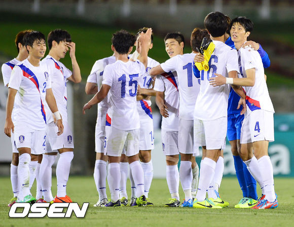 경기를 마치고 축구국가대표팀 선수들이 포옹을 하며 기쁨을 나누고 있다. /spjj@osen.co.kr