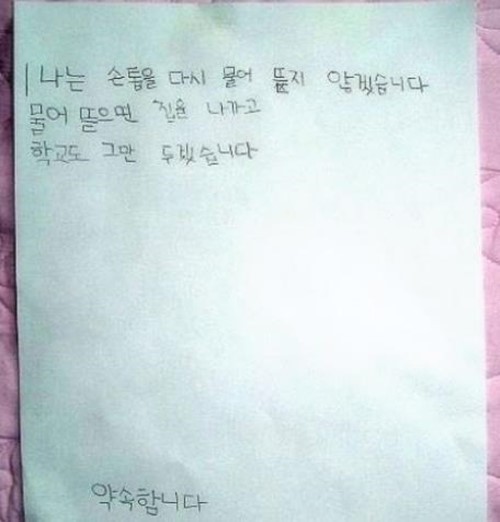 학생은 손톱을 물어뜯는 고약한 버릇 때문에 평소 부모님에게 수차례 지적을 당했던 것이 분명하다. 이에 반성의 의미로 각서를 쓴 것이다. 하지만 지나치게 진지한 약속에 읽는 사람의 폭소를 자아낸다.
