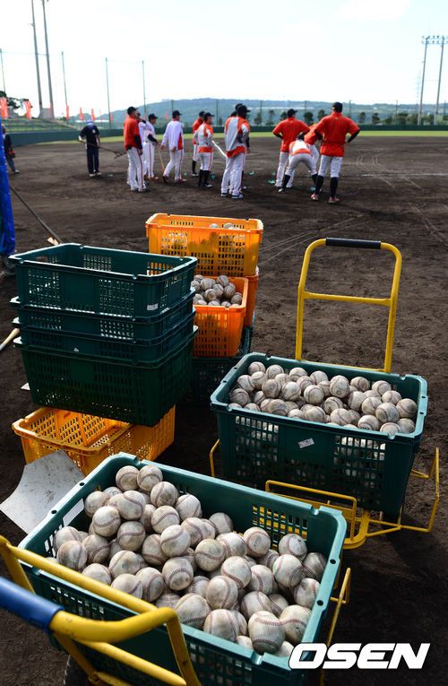 26일 오전 일본 오키나와 고친다구장에서 한화 선수들이 훈련 준비를 하고 있다.