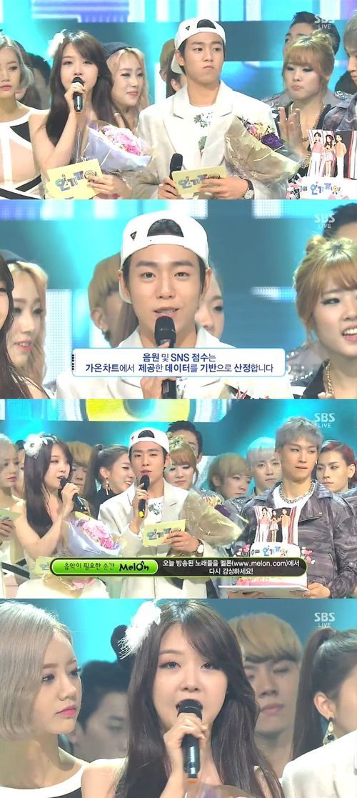 한편 이날 '인기가요'에는 비&태진아, 에일리, B1A4, 럼블피쉬, 달샤벳, 김종서, 걸스데이, 효린, 코요태, AOA, 갓세븐, 레인보우 블랙, 탑독, 로열 파이럿츠, 더 씨야. 블레이디, 에어플레인, 홍대광 등이 출연해 화려한 무대를 꾸몄다.
