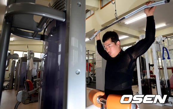 26일 오후 일본 오키나와 고친다구장 인근 헬스장에서 정근우가 웨이트 훈련을 하고 있다.