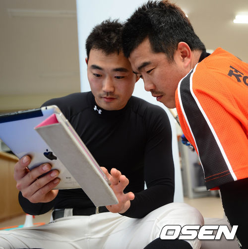 26일 오후 일본 오키나와 고친다구장 인근 헬스장에서 송광민과 정근우가 태블릿PC로 훈련 사진을 보고 있다.