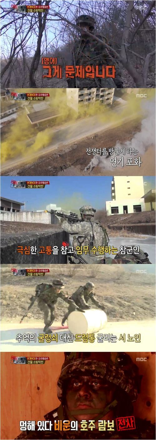 한편 스타들의 군체험을 다루는 ‘진짜사나이’는 이날 육군 천마대대 번개부대 첫 번째 이야기가 펼쳐졌다. 번개부대는 한미 연합훈련이 진행되는 부대다. 이 프로그램은 김수로·서경석·샘 해밍턴·류수영·장혁·손진영·제국의 아이들 박형식이 출연하며, 내레이션은 가수 장기하가 맡았다.