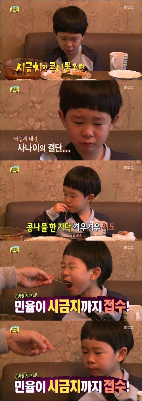 이날 방송에서 김민율은 식탁에 올라온 콩나물과 시금치를 보고 눈물을 흘렸다. 하지만 김성주는 이를 먹지 않으면 같이 여행을 가지 않겠다고 으름장을 놨고 아빠와 여행을 가고 싶어하는 김민율은 눈물을 흘렸다. 김성주 역시 김민율의 편식을 고치기 위해 물러서지 않았고 김민율을 울면서 콩나물을 먹었다. 하지만 시금치는 먹지 않았다.