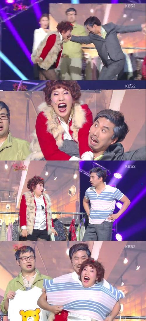 이렇게 김영희는 부담스러운 색조 화장과 패션을 완벽하게 소화, 걸걸한 사투리로 부담스러운 애교를 부리며 정태호와 능청스러운 커플 연기를 선보여 객석을 초토화시켰다.