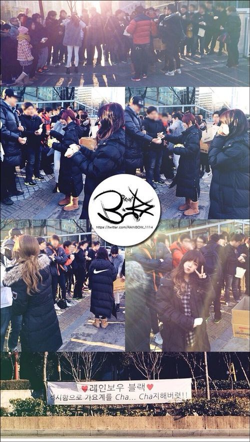 지난 26일 오후 레인보우의 공식 트위터와 페이스북을 통해 레인보우 블랙의 첫 번째 방송 현장 사진이 공개됐다. 이 사진에는 동 트는 거리에서 팬클럽에게 직접 선물을 나눠주고 있는 레인보우 블랙 멤버들의 훈훈한 모습이 담겨있어 눈길을 끌었다.