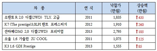 총 출품 차량은 708대로 이 중 449대가 낙찰됐으며, 고객의 희망가 대비 낙찰가가 상승한 주요 차량은 표와 같다.