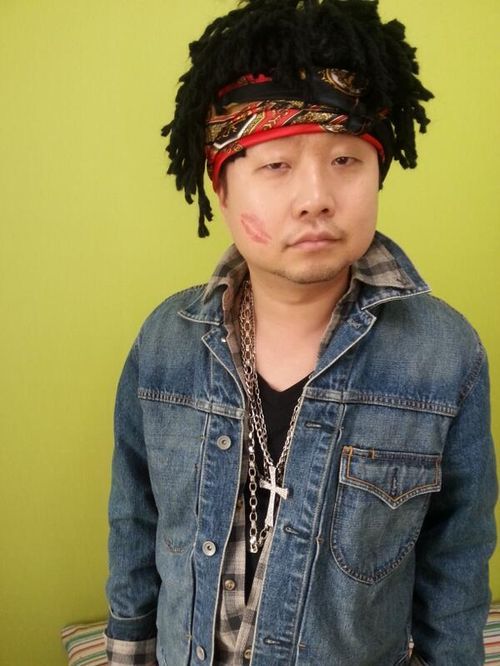 사진 속 박휘순은 비가 무대에서 시도한 히피 패션을 완벽하게 따라했다. 그는 머리를 화려한 끈으로 묶고 여자 입술 자국까지 볼에 찍었다.