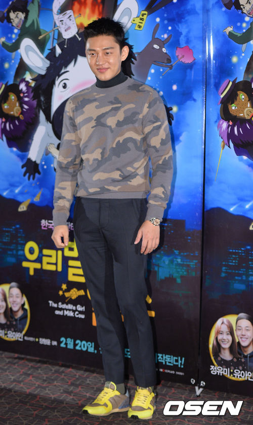 배우 유아인이 27일 오후 서울 행당동 CGV왕십리에서 열린 애니메이션 영화 '우리별 일호와 얼룩소' 언론시사회에 참석해 포토타임을 갖고 있다.