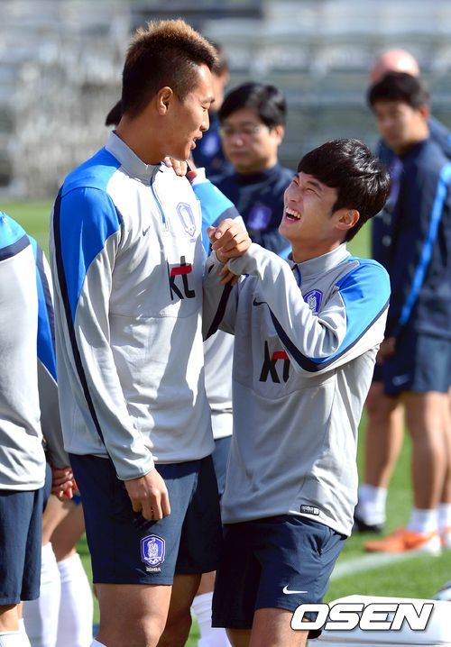 훈련 전 김진수가 김신욱과 밝은 표정으로 이야기를 나누고 있다. /spjj@osen.co