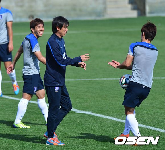 홍명보 감독이 박진포에 헤딩볼을 던져주던 김태환에게 운동이 되게 던지라며 장난처럼 공을 던지고 있다. /spjj@osen.co.kr