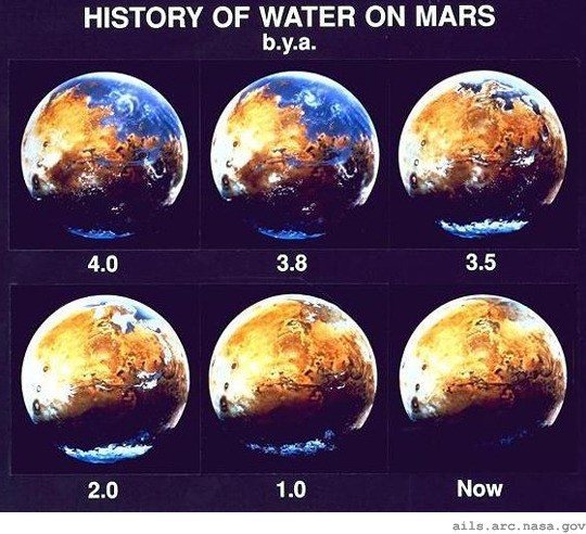 최근 한 온라인 커뮤니티에는 '40억 년 전 화성'이라는 제목의 사진 한 장이 올랐다. 공개된 사진은 지난 40억 년 전 화성이 어떻게 변화했는지 38억 년 전, 35억, 20억, 10억 전을 거치면서 한 눈에 보여주고 있다.