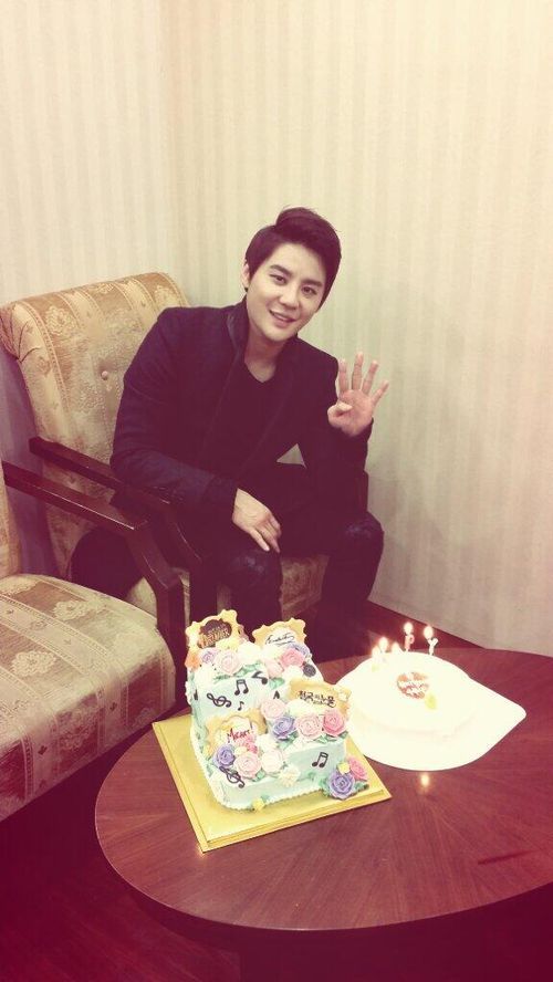 공개된 사진 속 김준수는 두 개의 케이크를 앞에 두고 카메라를 향해 환한 미소를 짓고 있다. 그는 손으로 숫자 4를 표시하며 뮤지컬 데뷔 4주년을 자축하고 있어 눈길을 끈다.