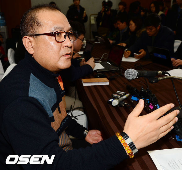 28일 오후 서울 송파구 방이동 올림픽파크에서 열린 이용대 도핑테스트 관련 긴급 기자회견에서 대한배드민턴 협회 김중수 전무가 기자회견을 하고 있다.