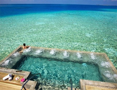 최근 온라인 커뮤니티 게시판에 '바닷속 개인 풀장'라는 제목으로 사진이 올라왔다. 사진은 몰디브의 한 산호섬에 있는 호텔이다. 이 호텔에선 수영이나 스파를 즐기면서 푸른 바다를 볼 수 있다.