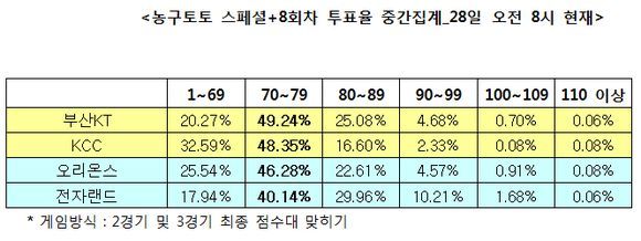 투표율을 살펴보면, 오리온스는 46.28%가 70~79점대를 선택했고 전자랜드는 그보다 조금 적은 40.14%가 같은 항목에 투표했다.