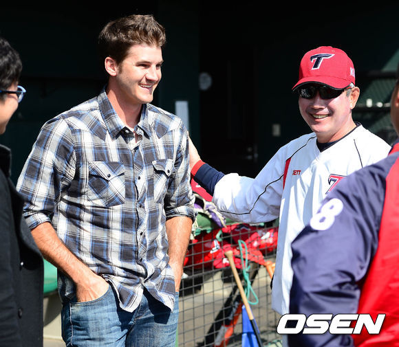 28일 오전 일본 오키나와 킨구장에서 한대화 수석코치가 브렛 필을 보고 미소를 짓고 있다.