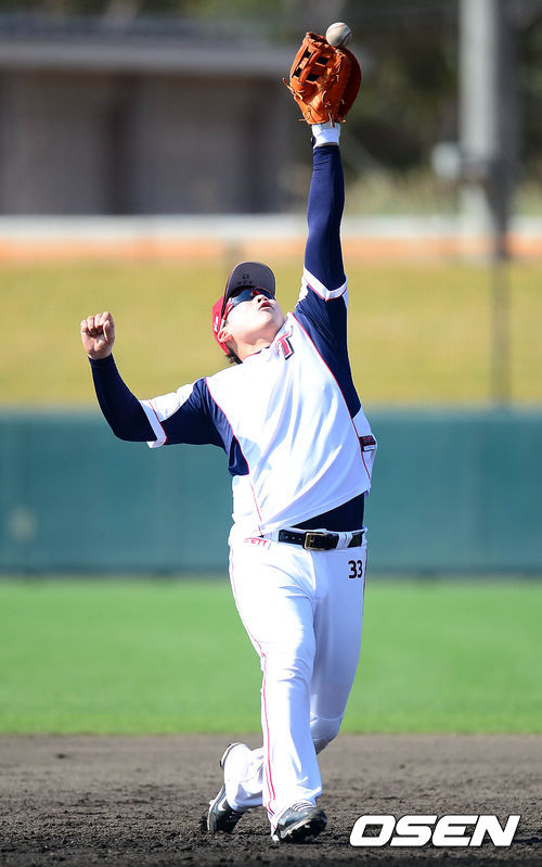 28일 오후 일본 오키나와 킨구장에서 김주형이 수비 훈련 중 바운드 볼을 놓치고 있다.