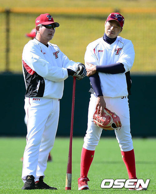 28일 오후 일본 오키나와 킨구장에서 한대화 수석코치와 김원섭이 이야기를 나누고 있다. 김원섭은 발꿈치 수술 재활을 위해 한국으로 먼저 귀국할 예정이다.