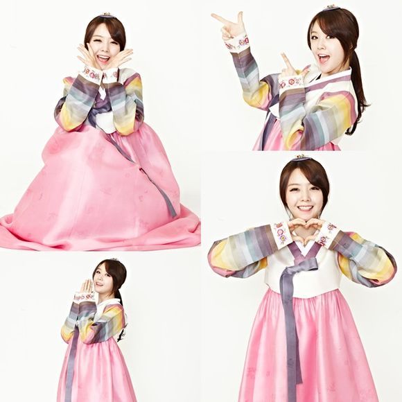 사진 속에서 민아는 분홍빛깔의 한복을 입고 있다. 분홍색의 한복치마에 무지개를 연상시키는 파스텔톤 색동저고리를 매치했다.