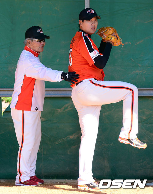 29일 오전 일본 오키나와 고친다구장에서 신용균 불펜코치가 유창식에게 투구폼을 지도하고 있다.