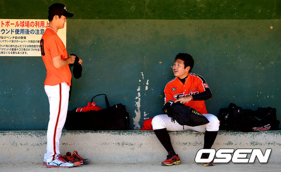 29일 오전 일본 오키나와 고친다구장에서 황영국과 조지훈이 이야기를 나누고 있다.