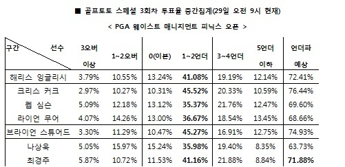 크리스 커크의 언더파 예상이 76.44%로 지정 선수 중 가장 높게 예상된 가운데, 브라이언 스튜어드(74.93%), 해리스 잉글리시(72.41%), 최경주(71.88%)가 그 뒤를 이었고 웹 심슨(69.60%), 라이언 무어(68.66%),, 나상욱(63.73%)의 언더파 예상도 비교적 높게 나타났다.