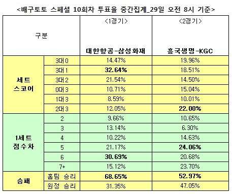 [배구토토] 국민체육진흥공단(www.kspo.or.kr)이 발행하는 체육진흥투표권 수탁사업자인 스포츠토토 공식 온라인 발매사이트 베트맨(www.betman.co.kr)이 오는 30일 열리는 2013-14시즌 국내프로배구(V리그)를 대상으로 한 배구토토 스페셜 10회차 투표율 중간집계 결과, 국내 배구팬 68.65%는 대한항공-삼성화재(1경기)전에서 대한항공의 승리를 전망했다고 밝혔다.