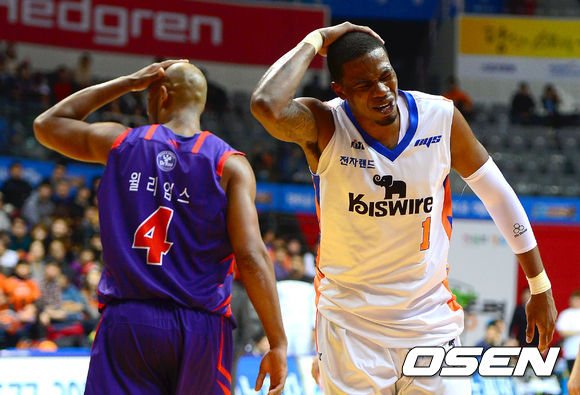 4쿼터 오리온스 윌리엄스와 전자랜드 로드가 리바운드 다툼을 벌이다 충돌한 뒤 고통스러워하고 있다.